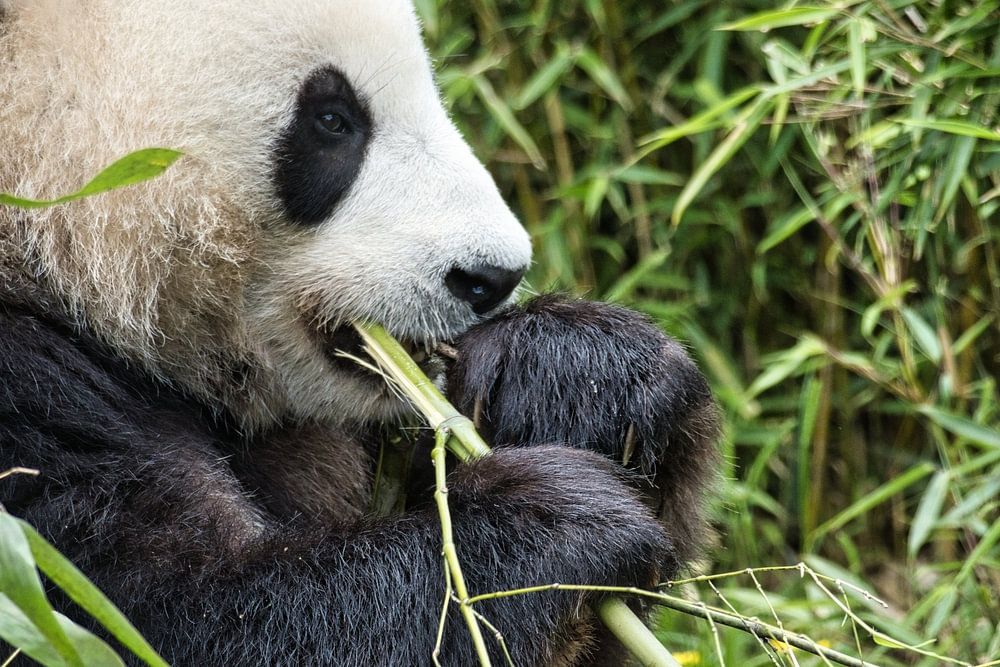 Reuzenpanda die bamboe eet. De bedreigde beer uit Azië met zwart-witte vacht. Dierenfoto van een uniek zoogdier.