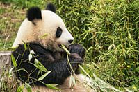 Reuzenpanda die bamboe eet. De bedreigde beer uit Azië met zwart-witte vacht. Dierenfoto van een uniek zoogdier.