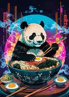 Reuzenpanda eet Japanse ramen in kom met neon sfeer