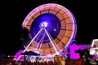 Deze foto toont een reuzenrad op een kermis tijdens de nacht, vastgelegd met een lange sluitertijd waardoor de lichten van het draaiende wiel een indrukwekkend patroon vormen. De verlichting van het reuzenrad bestaat uit heldere gele en paarse tinten, die in cirkels over de structuur bewegen en een hypnotiserend effect…