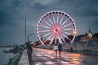 Nachtfoto van het reuzenrad "The View" op het Steenplein in Antwerpen. De foto werd genomen vanop de kaai langs de Schelde met een lange sluitertijd wat zorgt voor wat beweging in de foto. Het had net geregend, wat zorgt voor mooie reflecties van de verlichting in de achtergebleven plassen.