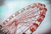 Foto van een reuzenrad in vintage analoge camerakleurtonen met grungestructuur. De foto roept herinneringen op aan een populaire toeristische attractie in een pretpark of kermis uit de jaren 1950 of 1960.