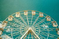 Retrobeeld van een reuzenreuzenrad met extra filmgrunge-textuur in pastelkleuren uit het midden van de vorige eeuw. Carnaval en kermis uit de jaren 1950 en 1960.
