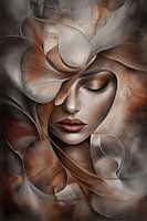 Abstract en sereen portret van een vrouw gesluierd met bloem- en boomschors bladeren in naturel en koper tinten.