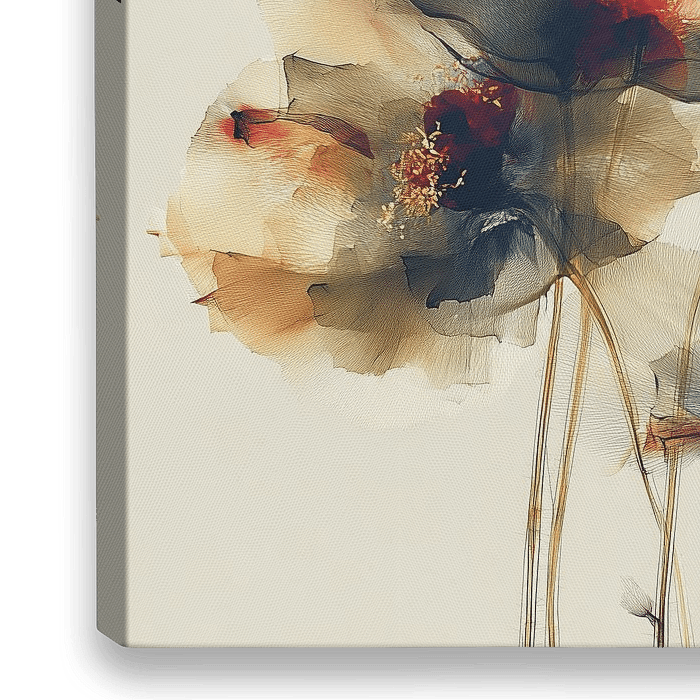 Een dromerig, etherisch digitaal schilderij van doorschijnende klaproosachtige bloemen in zachte aquareltinten. De bloemblaadjes lopen in elkaar over in crème-, goud-, blush- en inktblauwe tinten, waardoor een abstracte maar elegante bloemencompositie ontstaat die zowel delicaat als expressief aanvoelt.