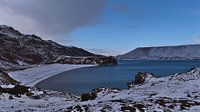 Ruw vulkaanlandschap met het Kleifarvatn-meer (vulkanisch systeem van Krýsuvík) met een besneeuwd strand, de Krýsuvíkurvegur-weg op een bewolkte dag in de winter. Het meer, omgeven door rotsachtige bergen, ligt op het schiereiland Reykjanes in het westen van IJsland.