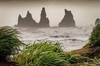 Doorkijkje vanaf het zwarte strand van Vík richting de pieken van Reynisdrangar
