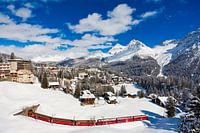 De Rhätische Bahn in de winter in Arosa in Graubünden, Zwitserland.
