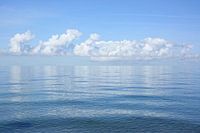 (Bijna) alleen water, lucht en wind: een herfstochtend op het strand van Heiligenhafen aan de Oostzee. Ostholstein, Sleeswijk-Holstein, Duitsland. Opgenomen in oktober 2020.