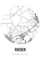 Zwart-witte landkaart, stratenplan of plattegrond van Rheden. Rheden is gelegen in regio Rivierenland, in de gemeente Rheden, provincie Gelderland. Op de stadskaart zijn alle openbare wegen in Rheden opgenomen. Verder is de kaart voorzien van de coördinaten van het centrum van Rheden.