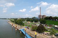 Duisburg Nordrhein-Westfalen Germany Hermann Wenzel power station. Along the banks of the Rhine in Rheinwiese Mühlenweide (Park) a Saturday market takes place. Duisburg Nordrhein-Westfalen Deutschland Kraftwerk Hermann Wenzel. Entlang des Rheinufers in der Rheinwiese Mühlenweide (Park) findet am Samstag ein Markt statt.