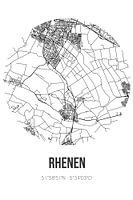 Zwart-witte landkaart, stratenplan of plattegrond van Rhenen. Rhenen is gelegen in de gemeente Rhenen, provincie Utrecht. Op de stadskaart zijn alle openbare wegen in Rhenen opgenomen. Verder is de kaart voorzien van de coördinaten van het centrum van Rhenen.