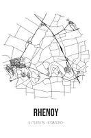 Zwart-witte landkaart, stratenplan of plattegrond van Rhenoy. Rhenoy is gelegen in de Betuwe, in de gemeente West Betuwe, provincie Gelderland. Op de stadskaart zijn alle openbare wegen in Rhenoy opgenomen. Verder is de kaart voorzien van de coördinaten van het centrum van Rhenoy.