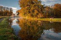Schitterende herfstkleuren op een ochtend in november. Twee ezels drinken wat water het lijkt wel een spiegel