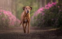Rhodesian Ridgeback tussen de Rhodondendrons