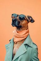 Een majestueuze Rhodesian Ridgeback straalt stoerheid en stijl uit. Met zijn opvallende, gespierde contouren en karakteristieke rugstreep trekt hij ieders aandacht. De zonnebril en chique halsdoek geven hem een vleugje elegantie, terwijl de zachte, warme kleur van de achtergrond zijn indrukwekkende aanwezigheid benadrukt. Een echt…