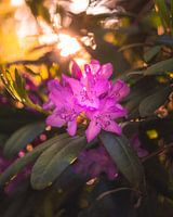 Deze betoverende foto legt een close-up van een prachtige Rhododendron-bloem vast, terwijl de achtergrond wordt overspoeld door de warme kleuren van een adembenemende zonsopkomst. De Rhododendron-bloem staat centraal in het beeld, met zijn weelderige bloemblaadjes die zich openen als een levend kunstwerk. De roze tinten van de bloem harmoniëren perfect met de gloeiende achtergrond, die wordt verlicht door de eerste stralen van de opkomende zon.