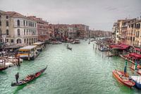 Een blik vanaf de welbekende Rialto Bridge in Venetië waar het een komen en gaan is van bootjes.