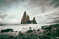 Een moody scene nabij Ribeira da Janela met de iconische rotsformaties voor de kust. Genomen vanaf een laag standpunt met een lange sluitertijd die zorgt voor een sluier van water over de keien in de voorgrond. De beweging die ontstaat in de dramatische wolken zorgt ervoor dat je ogen naar het midden van de scène geleid worden.