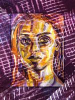 Portret van een vrouw, mixed media. Lijnen gaan door haar gezicht staan symbool aan gedachten die ze heeft waaraan ze richting wil geven: een doel. Focus!