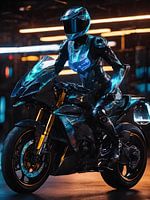 Deze vrouw is geen passagier van het leven, maar de bestuurder. Met vastberaden blik stuurt ze haar machine door een wereld die niet gebonden is aan regels of grenzen. De motor is een symbool van verbeelding en durf – een voertuig dat haar meeneemt naar dimensies voorbij het gewone, waar dromen en werkelijkheid samenvloeien.