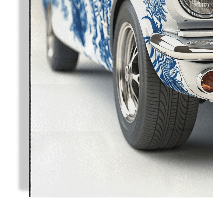 Details van de koplamp van een oud model Mustang in het wit met Delfts blauwe bodywork.