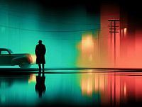 Dramatisch neon-kunstwerk van een eenzame figuur in lange jas die staat in de regen, met felle turquoise, rood en oranje neonlichten die reflecteren op nat asfalt en een klassieke auto op de achtergrond.