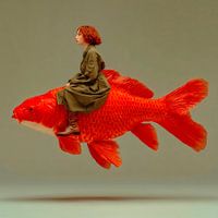 Een surrealistische kunstwerk met een jong meisje zittend op een gigantische goudvis. De algehele compositie moet het fantasierijke karakter van het kunstwerk benadrukken.