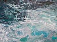 De dynamiek van de golven en opspattend water geeft dit beeld een krachtige energie. Donkere partijen en transparatie waar licht in het water doordringt wisselen elkaar af. Het schuim van de golven reflecteert het licht en zorgt voor fijne contrasten.