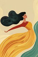 Deze afbeelding toont een gestileerde vrouwenfiguur met een opvallend lang en krachtig golvend haar dat achter haar beweegt alsof het wordt meegevoerd door de wind. Ze heeft een uitdrukkingsloos gezicht maar haar houding straalt zelfverzekerdheid en kracht uit. De kleuren oranje, rood en geel domineren haar kledij en silhouet, terwijl subtiele tinten groen en beige de achtergrond vormen. Het beeld geeft een gevoel van gratie, dynamiek en zelfexpressie weer.