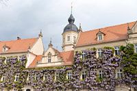 Riesa Saxony Germany. Rathaus town hall covered in blue wisteria vines in flower. Riesa Sachsen Deutschland. Rathaus bedeckt mit blauen Glyzinienreben in Blüte.