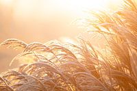 Deze horizontale close-up toont rijp bedekt riet dat zachtjes meebuigt in de ochtendbries, gevangen in een zee van goudgeel licht. De delicate ijsrandjes op de pluimen reflecteren de eerste zonnestralen en geven het beeld een haast magische glans. De warme gloed en subtiele beweging stralen rust, tederheid en natuurlijke elegantie uit – een ideaal werk voor wie verlangt naar sereniteit en zachte aardse tonen in het interieur.
