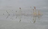 Bevroren hoog water waar riet in vastzit in de Betuwe.