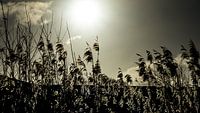 Oud verdroogd riet uit de zomer en het najaar staat in de kille winterzon langs de spoorlijn in Purmerend. De zon staat nog steeds laag en het wittige zonlicht schijnt door de pluimen heen die voor een deel oplichten en het licht verspreiden. Er zijn verder wat wolkjes aan de hemel. Het geheel maakt een fris beeld van het koude seizoen.