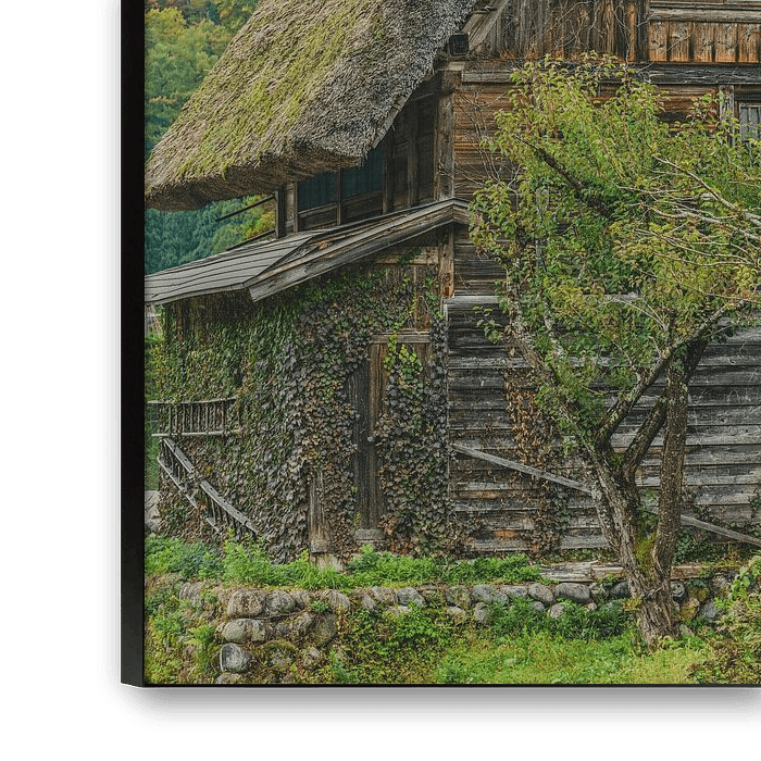 Dit indrukwekkende werk is een detailopname van een traditioneel Japans boerenhuis in de unieke gasshō-zukuri (biddende handen) stijl, te vinden in het beroemde dorp Shirakawa-go. De regio staat, samen met Gokayama, op de UNESCO Werelderfgoedlijst vanwege deze zeldzame en bewaard gebleven architectuur.