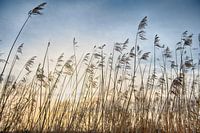 Sfeervolle High Dynamic Range (HDR) foto van riet met prachtige pluimen, tegen een ondergaande zon. De warme natuurlijke kleuren van het riet geven de foto een zomerse sfeer. De foto is gemaakt in natuurgebied Vlijmens Ven bij Vlijmen, Noord-Brabant.