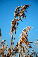 Rietpluimen met rijp met een felblauwe lucht op de achtergrond. Winter in Nederland.