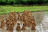 Karakteristiek boerenlandschap van natte rijstvelden in Yangshuo, Guilin, Guangxi, China. Bijeen gebonden bossen riet, rietbundels op landelijke akkers doen dienst als vogelverschrikker om te voorkomen dat vogels de zaadjes uit de velden oppikken. Akkerland, rietland, boerenland in het Karstgebergte, Karstbergen.