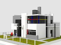 Rietveld Schröder Oostaanzicht. Het Rietveld Schröderhuis is een vermaard Nederlands architectonisch ontwerp van architect, ontwerper en meubelmaker Gerrit Rietveld. Het huis, gelegen in Utrecht, werd ontworpen in 1924 en voltooid in 1925. Deze 3D orthografische render van het huis toont het oostaanzicht, dat wordt gekenmerkt door een symmetrische structuur met een plat dak, witte muren en een reeks grote ramen. Het modernistische ontwerp van het huis weerspiegelt de invloed van de kunstbeweging De Stijl, en wordt beschouwd als een belangrijk voorbeeld van moderne architectuur. Het huis is liefdevol bewaard gebleven, en het is duidelijk waarom fans van Rietvelds werk graag zijn creaties bouwen - het ontwerp is tijdloos en mooi.