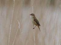 Rustiek plaatje van een rietzanger zingend in het riet
