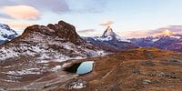 Zonsopgang op de Matterhorn en de Riffelsee in het kanton Wallis in Zwitserland.