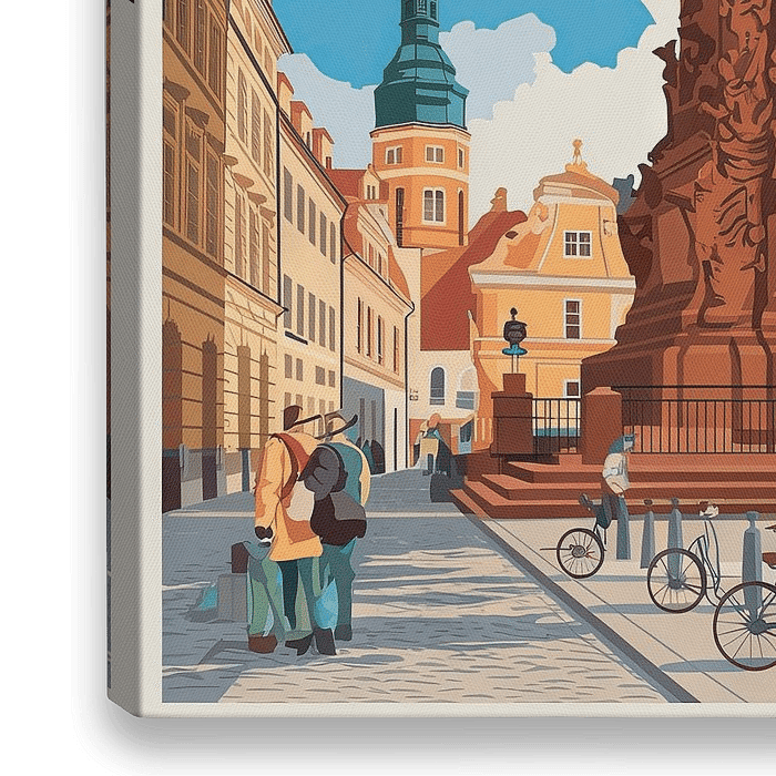 Een indrukwekkend stadsgezicht ontvouwt zich onder een helderblauwe hemel. Trotse architectuur omlijst het monumentale gedenkteken, dat met zijn sierlijke figuren de trots van Riga belichaamt. Fietsers en voorbijgangers brengen het levendige plein tot leven, terwijl de opvallende kerk op de achtergrond de aandacht trekt. Een perfecte…