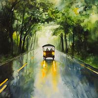 Een glinsterende sluier van regen omhult een smalle weg met majestueuze bomen in weelderige groentinten. Een gele auto glijdt over het glimmende asfalt, terwijl de weerspiegelingen van het water een impressionistisch schouwspel creëren. De mist omarmt het landschap en laat de kleuren schitteren in een droomachtig licht.