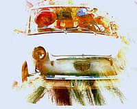 Fotokunst van een stel dat zich vermaakt tijdens een autorit in een witte klassieke auto. Top down en heldere zonnehoeden terwijl de auto door Italiaanse straten rijdt. De auto weerspiegelt de zon en het gelukkige humeur van de passagiers.