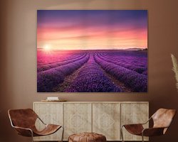 Lavendelbloemvelden in eindeloze rijen bij zonsondergang. Valensole plateau, Provence, Frankrijk.