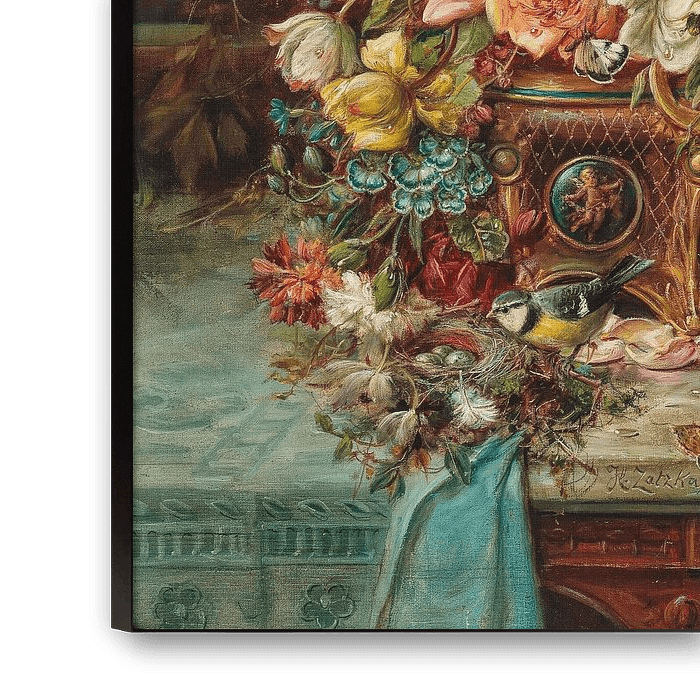 Rijk bloemenstilleven met pimpelmeesjes voor een weids landschap, Hans Zatzka
