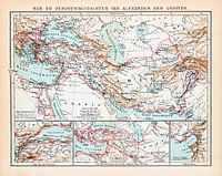 Op deze antieke kaart uit ca. 1900 staat het rijk van Alexander de Grote afgebeeld alsmede zijn veroveringstochten. De kaart is in kleur.