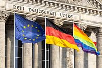 Het Rijksdaggebouw in Berlijn, zetel van de Duitse Bondsdag (parlement). Het beroemde opschrift op het hoofdportaal "Dem Deutschen Volke" met de vlag van de Europese Unie, de nationale vlag en de regenboog/ LGBT+ vlag. Voor het laatst gehesen ter gelegenheid van de Christoper Street Day in Berlijn.