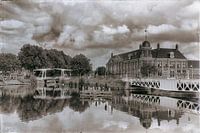 De Rijksmunt in Utrecht, met op de voorgrond het water van het Merwedekanaal, en links de Abel Tasmanbrug die over de Leidse Rijn naar Lombok leidt. Het gebouw van de Rijksmunt dateert uit 1910 en is ontworpen door rijksbouwmeester C.H. Peters. De Munt is een rijksmonument in de neorenaissance stijl en is onder meer in de gevels voorzien van symbolieken met betrekking tot het geld. Rechts is de nieuw aangelegde Muntbrug te zien. Deze foto is 17 september 2017 genomen en uit historische overwegingen in zwartwit uitgevoerd. Deze foto behoort tot de serie Moderne Geschiedenis.