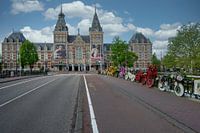 Dit werk toont het volledige vooraanzicht van het Rijksmuseum in Amsterdam gezien vanaf de Museumbrug. Rechts is een serie fietsen te zien, geparkeerd tegen de brugleuning en stuk voor stuk opgesierd met bloemen , klokken e.d.